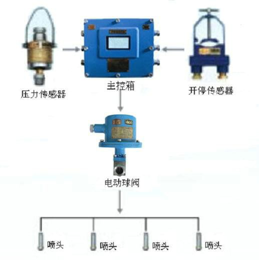 只有水壓傳感器檢測(cè)到采煤機(jī)水采水路中有一定的水壓(或工作燈開(kāi)啟)時(shí),才能允許啟動(dòng)采煤機(jī)。采煤機(jī)開(kāi)動(dòng)后,開(kāi)停傳感器(或光控傳感器)將信號(hào)送入主控箱,主控箱控制電動(dòng)球閥開(kāi)啟,實(shí)現(xiàn)對(duì)產(chǎn)塵點(diǎn)進(jìn)行噴霧降塵。采煤機(jī)停機(jī)(或采煤機(jī)工作燈關(guān)閉)后,主控箱控制電動(dòng)球閥延時(shí)一定的時(shí)間后關(guān)閉,停止噴霧降塵。